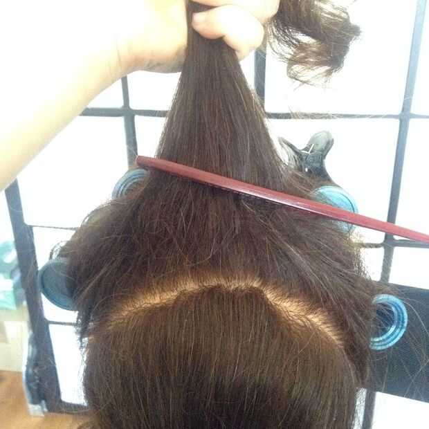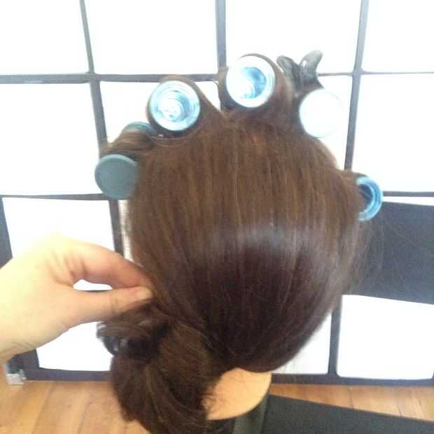 Retire los rodillos calientes. Peine trasero. Giro alrededor de la cola de caballo también en dirección a la derecha, pin dejar los extremos hacia fuera.