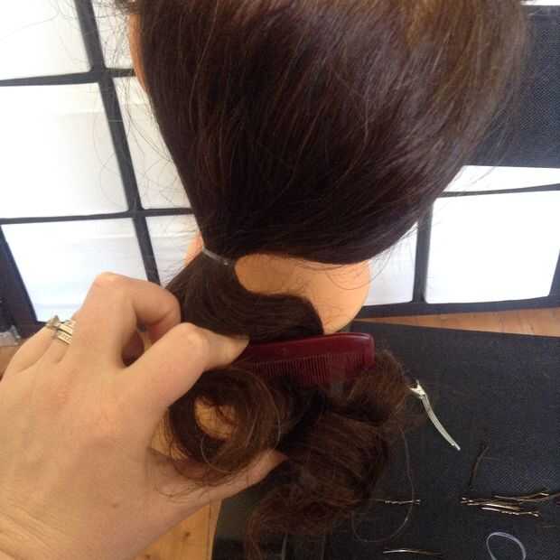 Quitar rodillos calientes de la cola de caballo y peine suavemente hacia atrás el cabello