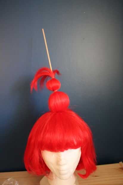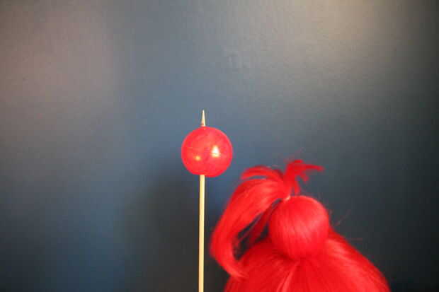 Meter la brocheta a través de la bola más pequeña y parcialmente en la bola más grande (tenga cuidado con este paso si usted es de cabellos de una persona real!). El pincho mantendrá las bolas en el lugar y el pelo erecto.