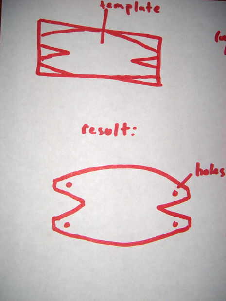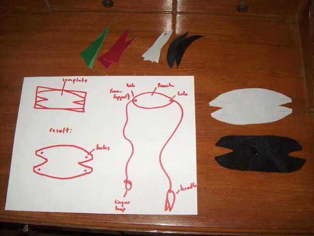 La bolsa se puede cortar a diferentes dimensiones y formas, pero normalmente utilizo un diseño básico a la medida de la cantidad de material que tengo. Como se ve en la imagen siguiente, la bolsa es una forma elíptica con cuñas de corte en los extremos. Las solapas resultantes deben tener un agujero perforado o raja en cada aleta. En anillos que he hecho, la bolsa puede ser amplia de 2.5 pulgadas o 7 pulgadas de ancho y 2 pulgadas de altura o 3.5 pulgadas de alto. De esa declaración, se dan cuenta que hay una gran variación en tamaño de bolsa.