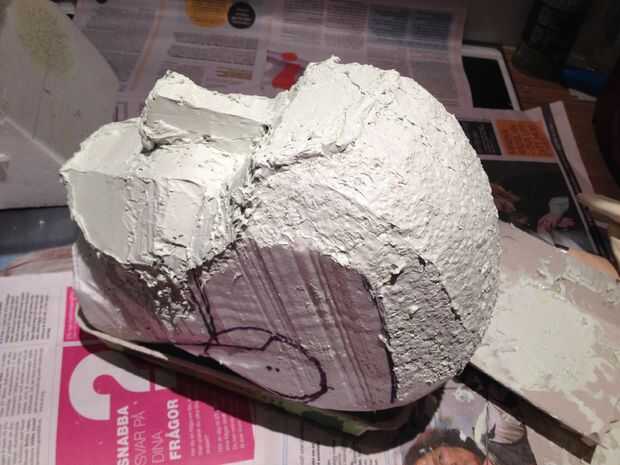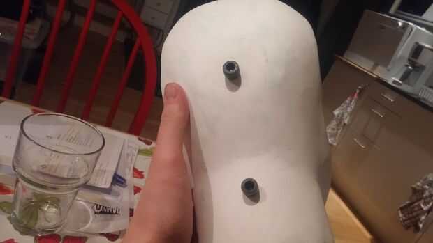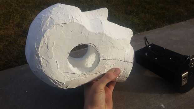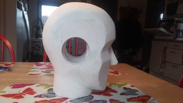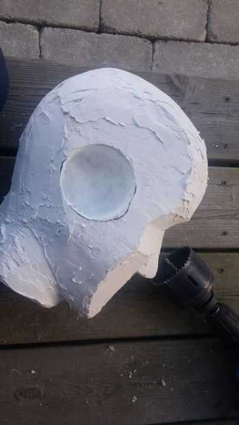 7, utilice una sierra para cortar los orificios donde van los oídos. También hacer un agujero hasta el cuello para la base de ajuste.
