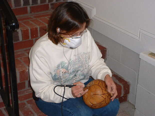 El cable que conecta las puntas a la unidad es largo y generalmente envuelve una vez alrededor del brazo que utilizo para grabar con. Mantiene el exceso fuera del camino y ayuda a controlar las puntas. En la siguiente imagen me recordó de un par de consejos extras. Use una máscara de filtro cuando quema. Los quemadores de madera crean humo que es peligroso para la respiración. También, encuentro ardiente de madera o la pintura, mi dedo meñique es una gran herramienta a utilizar para calmar mi mano (y siempre está disponible). Tenga cuidado donde haces esto. Las chispas pueden bajar de su calabaza. Asegúrese de que no se queme cuando esto sería una mala cosa. Tenía varios gota en mis jeans y tenía que cepillar inmediatamente. Nada quemado, pero vale la pena prestar atención.