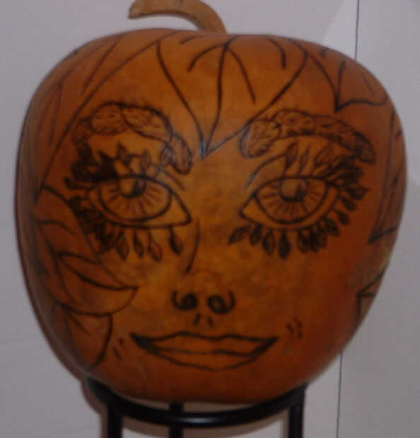 5. no, no vamos a fijar la calabaza en el fuego. Se llama pirograbado - dibujar o escribir con una instrumento para marcar permanentemente diseños de leña. Usted puede comprar estilos más baratos en tiendas de artesanía, pero si realmente quieres llegar a hacer un montón de calabazas, invertir en un estilo más profesional. Yo uso la calabaza unidad Nibsburner, que es una buena estufa de leña, pero no una de las unidades más caras. Calienta hasta varios cientos grados en sólo siete segundos y se refresca apagado apenas como rápidamente, haciéndolo fácil cada tanto una pausa para afilar la hoja. Para esta calabaza usé una punta HD SF1 para el rostro y una HD #5 para las hojas. Después de terminar quemando la calabaza entera, lijar nuevamente para suavizar la superficie. Quema de hojas de un borde áspero a las áreas quemadas.