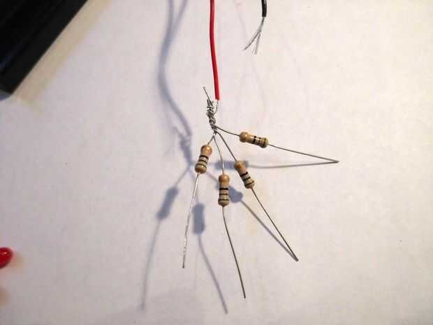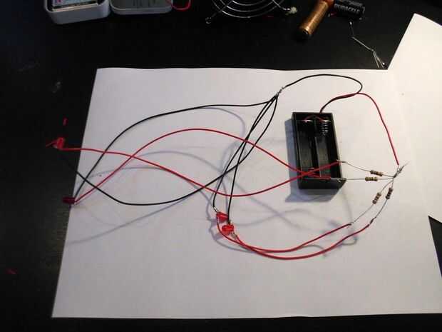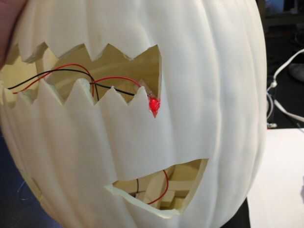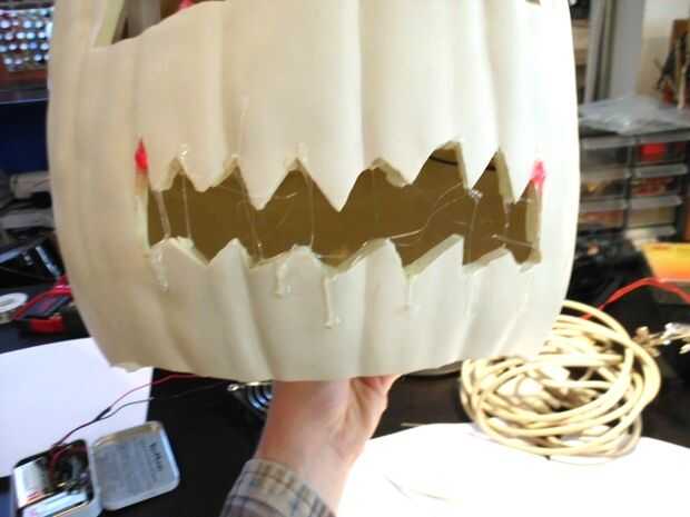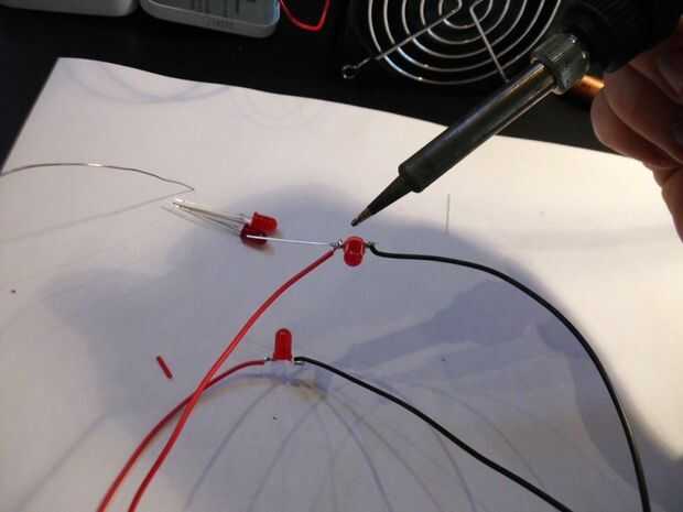 Entonces quieres hacer luz. Hice un simple circuito de 4 leds soldada en paralelo. Una vez que los tenga juntos, pegamento caliente en la cabeza de calabaza.