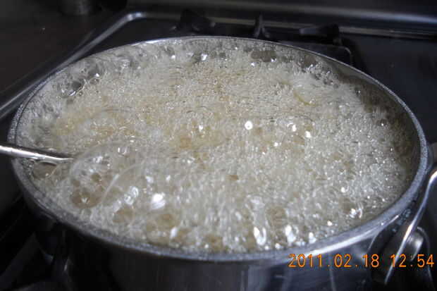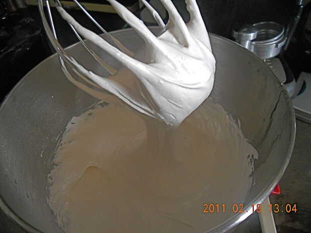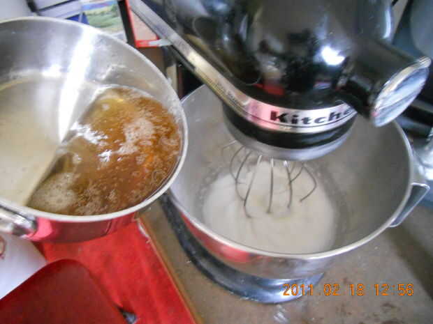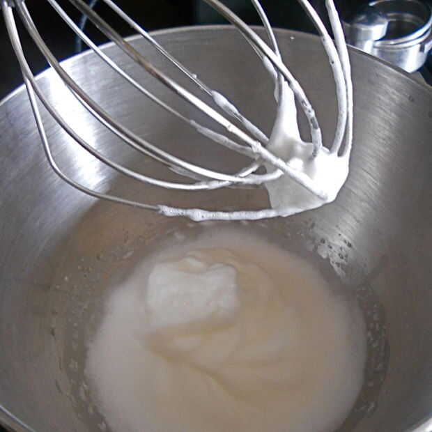 Mientras tanto batir las claras de huevo hasta que estén firmes pero no secas. Seguir para batir a velocidad lenta mientras haces un regate en el jarabe caliente. Agregar luego la vainilla.