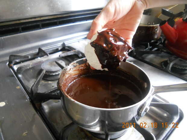 Echar las gotas blancas de lo de chocolate, el malvavisco todo pero dejando la cookie descubierto. Doble inmersión no es sólo aceptable, es necesario (lamiendo los dedos, por el contrario, no es muy aceptable pero puede que sea necesario). Cuando el chocolate se podría ser más fácil de usar una espátula para untar en. Poner en la nevera para establecer.