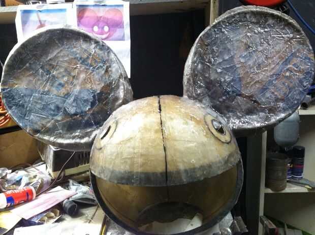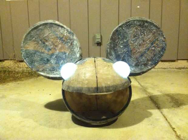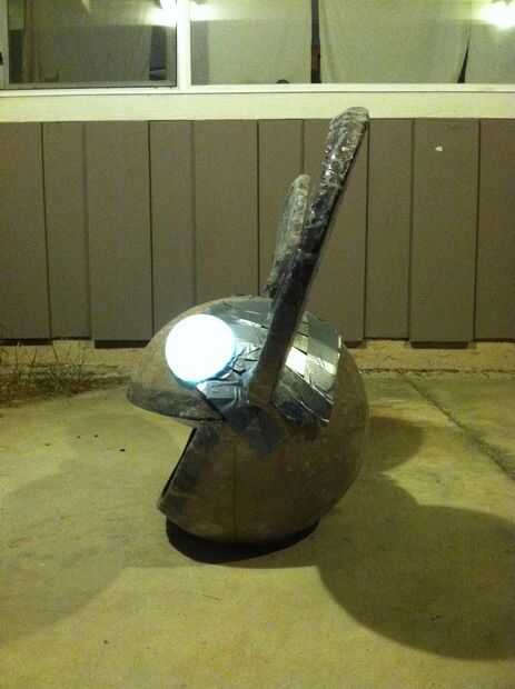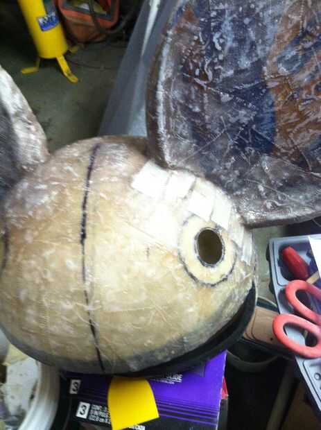2PE pegar las orejas en. Hice una malla de alambre con malla de 1/4" pesado y otro con la pantalla de la ventana para cubrir la boca y disfrazar al portador. Tuve cuidado intentar que el ángulo de las orejas y el eje incluso. Spray pintado blanco. Puedes ver cuánto la galv se extiende más allá de la base de las orejas. Pensé que sería un punto débil. La pantalla lo suficientemente oculta su cara, pero todavía permite buena visibilidad.
