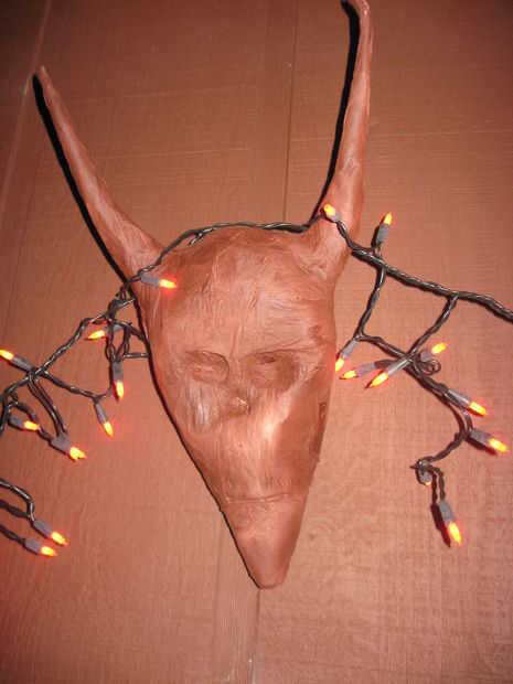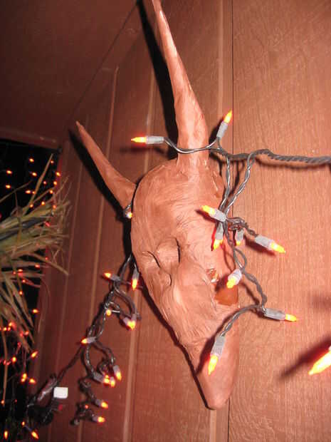 Colgaron la cabeza en una pared fuera de mi casa y vestido algunas naranja "Luces de Halloween" en los cuernos. Realmente no creo que cualquier truco o tratadores notado realmente la cabeza del demonio, pero que no sorprende demasiado ya que sólo diez llegó a la puerta este Halloween (abajo más de 100 el año pasado).