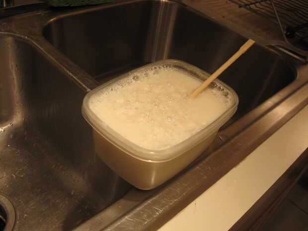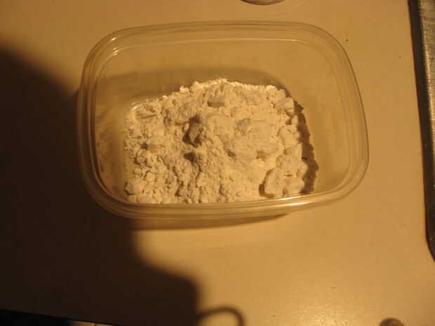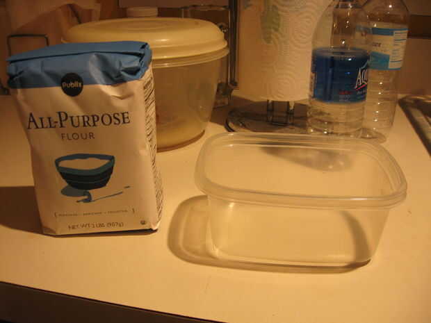 2 - conseguir harina. Normal blanqueada harina funciona bien. Poner unos spoonfulls en el envase. La cantidad exacta no importa. Realmente no tengo ninguna cantidad que guardo a cada momento. Si no es suficiente harina, añadir más.