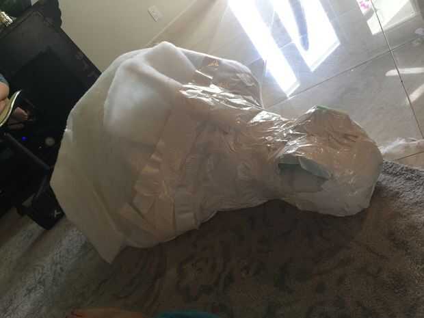 Entonces, formó pollo alambre alrededor de la caja de jarras y usa más cinta para asegurarlo. Luego lo cubrió con bateo y usted lo conjeturaba, más cinta. Hola, figura si los niños pueden hacer bolsos y trajes con cinta adhesiva, puedo hacerlo! Pinzados en alrededor del hocico y agregar unos trozos de espuma por la nariz. Trabajo hacia atrás, formando la forma y me fui.