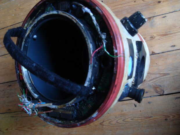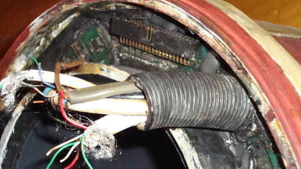 Diferentes longitudes de datos de cables - CAT5, usb, red eléctrica - fueron despojados y deshilachados. Los cables fueron agrupados en manguera flexible para máquina de lavar. Esto fue empujado a través de un agujero en la tapa y asegurar con pegamento caliente. Sólo comprendí luego que el jefe no siente nivel - idealmente, ningún cable debe ser inferior por cuanto el cubo interno sobresale.