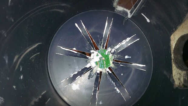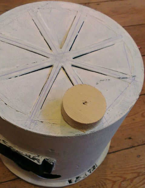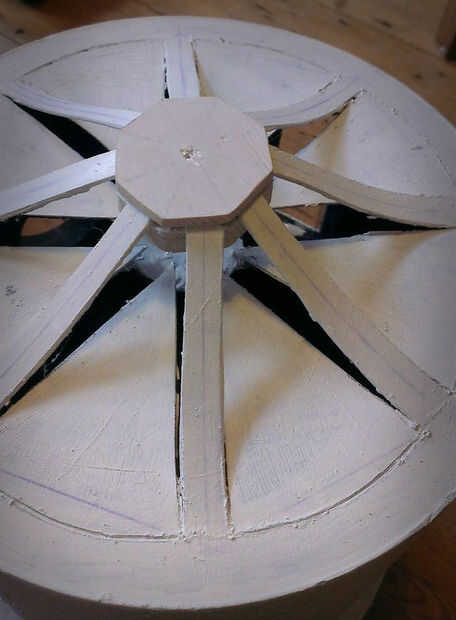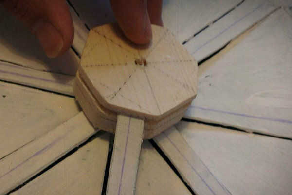 Por suerte, tenemos el disco madera sobrante cortar con el agujero que vimos anteriormente. Colocar la madera sobre el centro y utilizando los paneles como guía, marcado y corte en un octógono. He cortado una ranura y había pegado los puntales uniformemente. Finalmente, los paneles triangulares se intercalan entre el octógono y un disco de plástico con un tornillo y un montón de pegamento caliente.