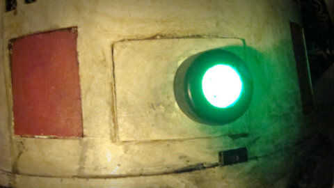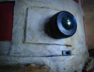 Hemos pegado un trozo rectangular de plástico desplazamiento sobre la superficie para hacer un panel levantado. Luego un pedazo corto 22mm de tubo de tuberías de plástico a través de un agujero perforado en el lado. Una tapa de bebidas con un orificio taladrado estuviera pegada a la antorcha del LED tubo y agreen insertada. En el extremo, un mármol empujado y pegado en lugar para añadir un brillo agradable. Puesto que esta luz era tan brillante, que realmente ayudó a detener los Jawas poco de tropiezos en las oscuras calles de.