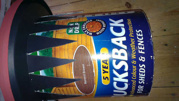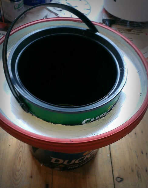 Por ahora el interior de la cubeta grande parecía bastante desordenado: lleno de agujeros, hilos, pegamento y trozos de madera y plástico. El lío de alambre y pegamento no iba a sobrevivir una vez que los niños y dulces fueron agregados a la mezcla. Por suerte, tuvimos otro cubo 5L más pequeño utilizar para cubrir esto.