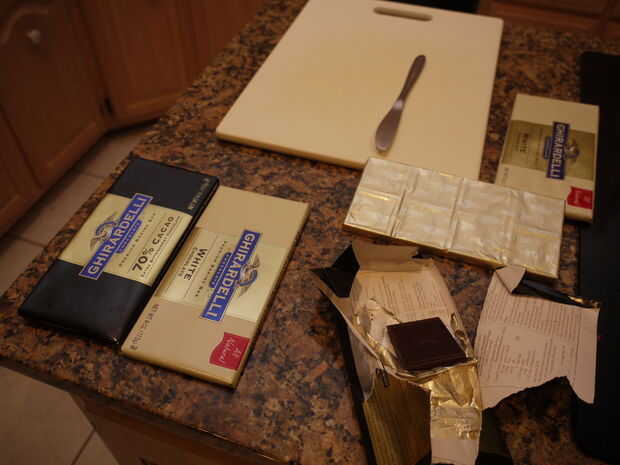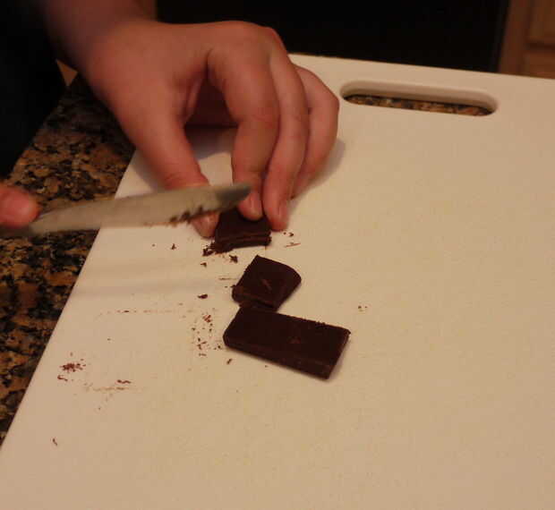 Si marcar un cuadrado de chocolate con un cuchillo--incluso un cuchillo de mantequilla, se puede dividir en cuartos. Luego puede cortar los cuartos en rectángulos según sea necesario.