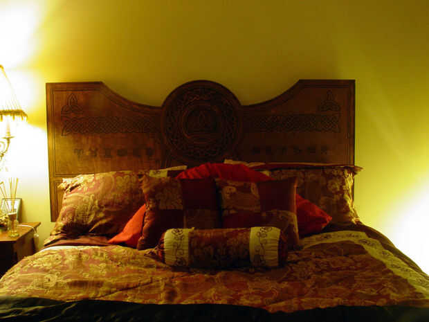 finalmente he terminado de tallar un proyecto principal de cama que me decidí a hacer. Es había hecha de MDF (tableros de fibra de densidad media) y había manchado con pintura acrílica y hervido en aceite de linaza. Ha tomado 3 semanas para terminar el proyecto y cuesta unos $35 todo a hacer - que incluye el MDF, las huellas del diseño de Officeworks y los tornillos de Bunnings. He encontrado algunos madera en el cobertizo que era perfecto para hacer las piernas así que no hay coste allí. Es nudo céltico inspirado, y los símbolos en la parte inferior son símbolos astrológicos.