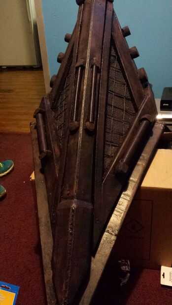 se trata de un rasguño construido traje que hice para una amiga de Halloween. La cabeza es hecha de espuma de poliestireno y algunas al azar piezas de ferretería para vestir fuera un poco. Las rejas a ambos lados son mano tejida de juncos de la cesta