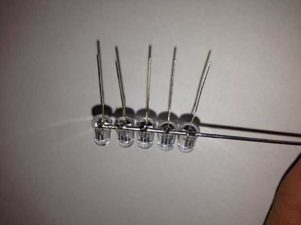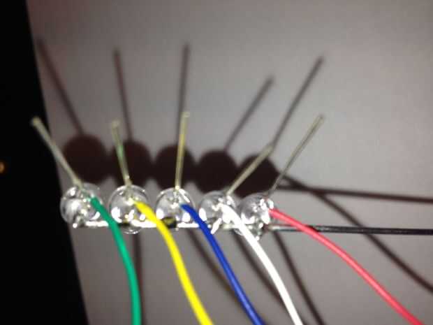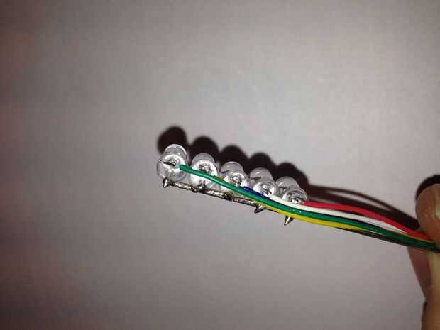 Darle a la barita de luz fuerza terminé usando hobbywire para conectar entre sí todos los negativos que luego se conectaría a través de un resistor de 220 Ohmios común a tierra (220 ohmios es suficiente porque uno un led se encenderá a la vez) y en el positivo soldar cables de diferente color. de arriba a abajo estaban soldadas en el siguiente orden.