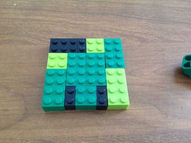 Las piezas que necesitará: 4 ladrillos de 2 x 4 verdes 1 ladrillo verde luz 1 ladrillo negro de 2 x 4 2 ladrillos verdes luz de 2 x 2 2 ladrillos negro 1 x 2