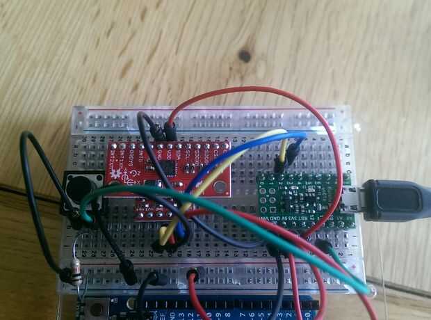 La forma más fácil de ejecutar el LSM9DS0 está en la interfaz I2C. Que permite el microprocesador hablar sobre una interfaz serial simple, que tiene bibliotecas estándar. Para ello, tenemos cable los pines SDA y SCL SDA y SCL pines en la placa 32U4, vía el convertidor de nivel de lógica para cambiar las señales de 3.3V a 5V.