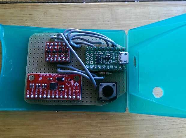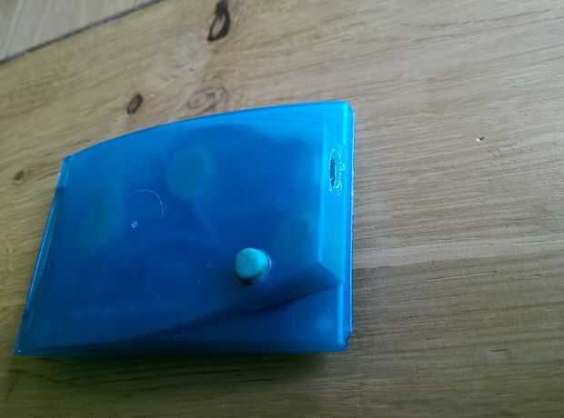 No es divertido tener una placa de circuito desnuda atada a la cabeza, sin dejar de mencionar el riesgo de estática, por lo que debe ser empacado en algo. Consideré una lata altoids, pero metal no es lo mejor para poner esto en, además de que es grande e incómodo. Afortunadamente, caminar demasiado en zapatos nuevos resultó en mí a vaciar una caja de yeso plástico ampolla que era de un tamaño perfecto para la placa (bueno, después de abajo del tablero con una dremel que era de todos modos). Además, era agradable y suave y confortable que han atado a la cabeza. Corte los orificios para que el conector USB y el botón, fijada la placa de circuito en lugar con algunos sugru y utilizada un poco de sobra sugru verde hacer una tapa de botón correspondiente para el caso.