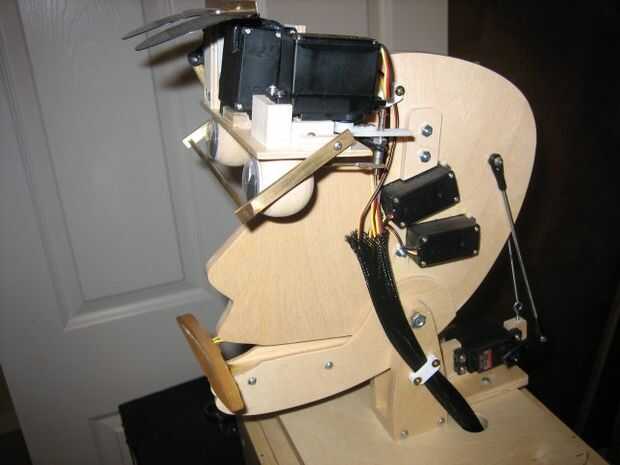 Una vez todas las piezas de madera de la cabeza se corta y prueba montado con servos, puse un par de capas de barniz de poliuretano en las piezas de madera.