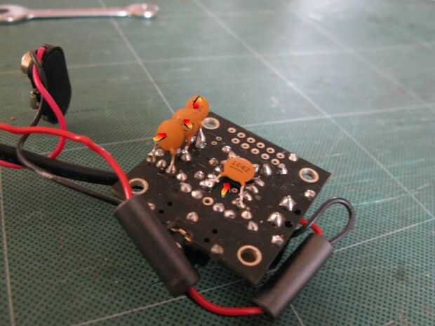 También, soldar los condensadores de otros a través de las líneas de alimentación de los servos. Vea la foto adjunta y tenga cuidado de no crear ningún cortocircuito.