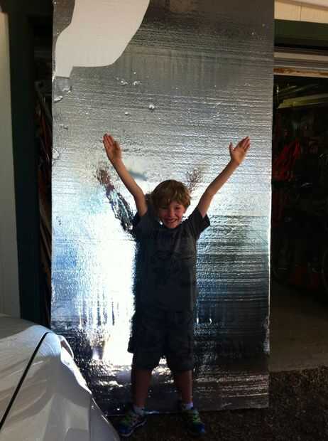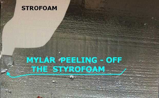 Con la hoja de espuma de poliestireno que se inclina contra la pared, pelando el Mylar plateado de un lado fue rápida y fácil para el capitán de la luz... Terminas con materia prima poliestireno en un lado y la etiqueta del fabricante en el otro lado.