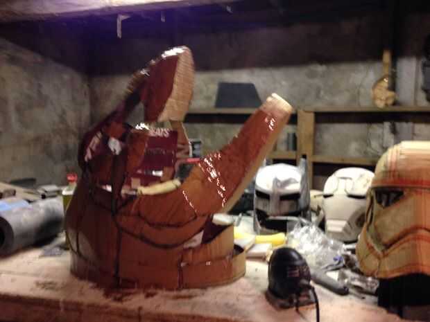 esto es una gran estatua de Velociraptor (modelado después de la versión de Parque Jurásico) hizo sobre todo de placas de espuma, tiras de yeso y pintura de aerosol. Primero había hecho una cabeza de T-rex con un método similar. Fue con esta cabeza d