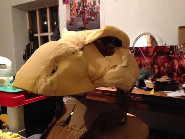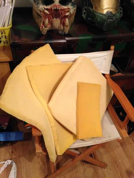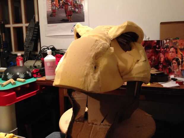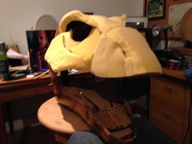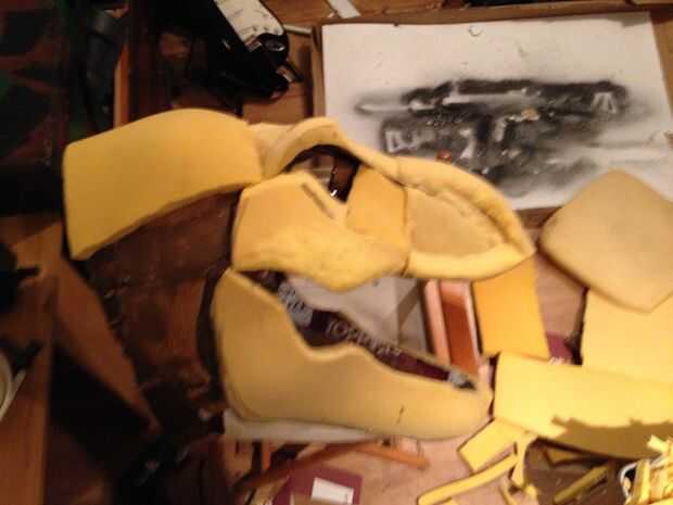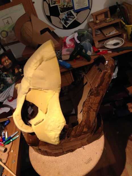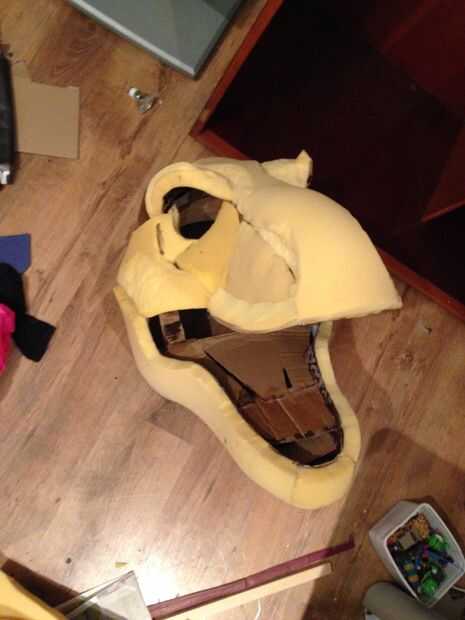 esto es una gran estatua de Velociraptor (modelado después de la versión de Parque Jurásico) hizo sobre todo de placas de espuma, tiras de yeso y pintura de aerosol. Primero había hecho una cabeza de T-rex con un método similar. Fue con esta cabeza d