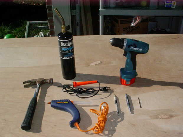 Necesitarás un martillo, taladro, broca 3/32, broca phillips destornillador o taladro, soplete de propano o similar, navaja tipo Exacto, 1 y 1/2 pulgada largo yeso o tornillo de máquina y soldadura opcional del hierro y el derriten caliente pistola de pegamento para construir la luz opción de ojos.