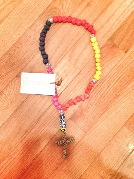Mi hijo tuvo que hacer un rosario de cosas que estaban alrededor de la casa. Tuercas y arandelas, legos, palomitas etc.... todo hecho antes. Mi esposa vio que un florero lleno de turcos cabeza nudos que he atado sobre los años y que era él.