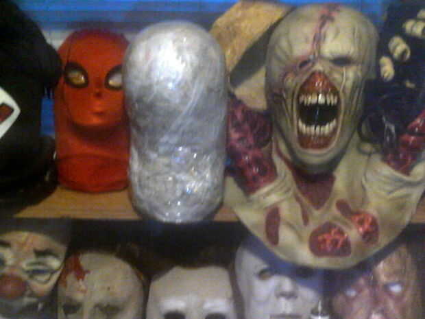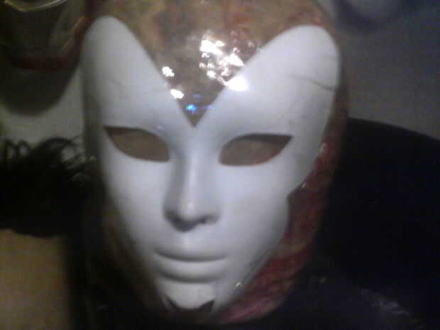 y tomar una máscara barata de plástico y cinta adhesiva a la cabeza de la bolsa de plástico para mascaras de tela. (es decir, rojo campana en foto)