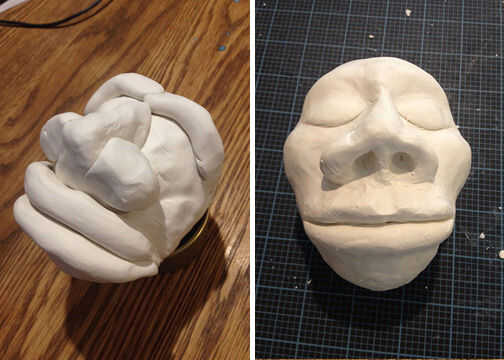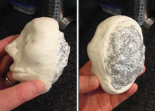 En primer lugar forma su papel de estaño en una bola del tamaño y forma la cabeza para ser. Hay un montón de buenas fotos en Internet para darle referencia para el tamaño. También tener en cuenta cómo desea que aparezca su cabeza. Quería colocar minas en una cúpula de cristal tenía que asegurarse de que encajaría. Utilice su pin de balanceo (si tiene uno) para rodar hacia fuera una hoja de arcilla para crear una capa de arcilla en la parte delantera de la mitad de la bola de papel de aluminio. Hacer una especie de forma de pirámide para la nariz y poner una masa de arcilla a cada lado donde van los orificios nasales. Estirar dos serpientes de arcilla para la los labios y dos serpientes más pequeñas para las cejas. Coloque dos grupos más de los huesos de la mejilla y dos trozos más pequeños para los ojos. Alisar la parte superior de los ojos en los zócalos del ojo, sino dejar una costura en la parte inferior. A partir de ahí, sólo forma cosas que cómo quiere. Terminé con un bastante exagerada de la boca y la nariz, que me gustó mucho. Lo bueno de este proyecto es que estamos haciendo papel maché para que pequeñas imperfecciones no importan al final. Cuando haya terminado, siga las instrucciones de su arcilla para cocer al horno para endurecerlo para arriba. A continuación, mezclar poco de pasta de papel maché. He utilizado un pegamento PVA parte blanca (pegamento de Elmer), una parte premezclado compuesto para juntas de panel de yeso y luego añade agua para hacer una goma que moquea. Debe ser suficientemente delgada como para cepillar en y absorba las toallas de papel. Luego romper sus toallas de papel resistente en pequeños trozos. Comienzo de rasgado y desechando todos los bordes rectos. La pluma de asperezas mejor y ocultar ayuda cualquiera parece. Su escultura de la cara con spray o jalea de petróleo para actuar como un molde que el papel maché bajar más fácil una vez que se seca la cubierta. Utilicé un plato de papel para mis piezas de toalla de papel en y entonces había cepillado la pasta a ambos lados de cada pieza de toalla de papel con un cepillo rígido arte barato. Una vez bien empapado lugar la toalla de papel piezas de uno a la vez sobre su cara esculpida. Utilizar el pincel en presionar a todos los rincones y grietas para obtener todos los detalles faciales. Cubrir toda la cara con una capa de toallas de papel, déjela secar durante aproximadamente una hora, luego seguir con una segunda capa. Usé un calentador pequeño para secar cosas más rápidas.