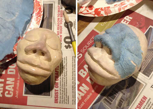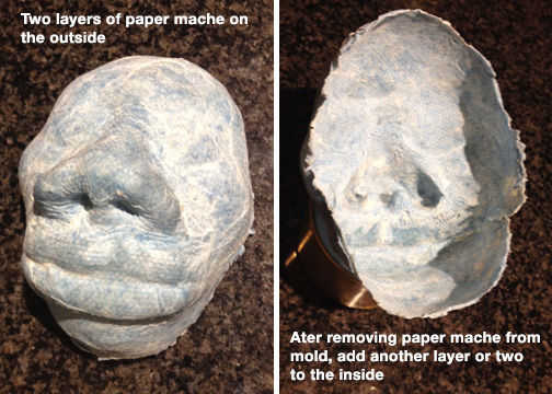 Mezclar poco de pasta de papel maché. Usé una parte blanca pegamento PVA (pegamento de Elmer), una parte premezclado compuesto de paneles de yeso y añade agua para hacer una goma que moquea. Debe ser suficientemente delgada como para cepillar en y absorba las toallas de papel. A continuación, arrancar sus toallas de papel resistente en pedazos pequeños y tiras. Empiezo por arrancar todos los bordes rectos. La pluma de asperezas mejor y ocultar ayuda cualquiera parece. Su escultura de la cara con spray o jalea de petróleo para actuar como un molde que el papel maché bajar más fácil una vez que se seca la cubierta. Utilicé un plato de papel para mis piezas de toalla de papel en y entonces había cepillado la pasta a ambos lados de cada pieza de toalla de papel con un cepillo rígido arte barato. Una vez bien empapado lugar la toalla de papel piezas de uno a la vez sobre su cara esculpida. Utiliza un pincel rígido en presionar a todos los rincones y grietas para obtener todos los detalles faciales. Cubrir toda la cara con una capa de toallas de papel, déjela secar durante aproximadamente una hora, luego seguir con una segunda capa. Usé un calentador pequeño para secar cosas más rápidas.