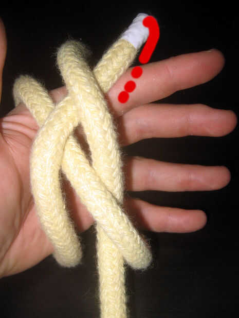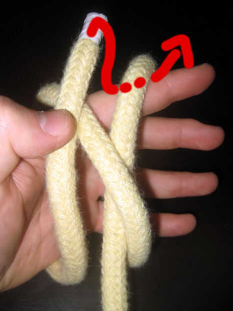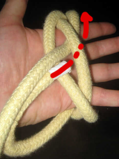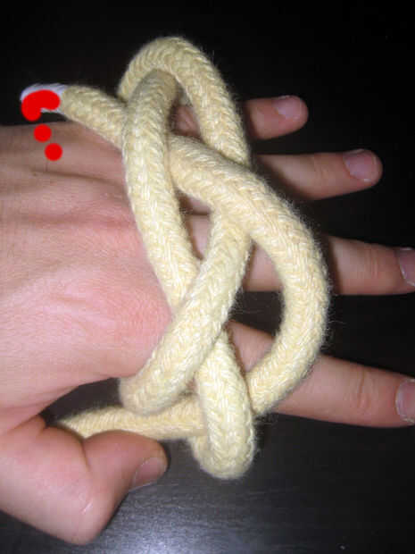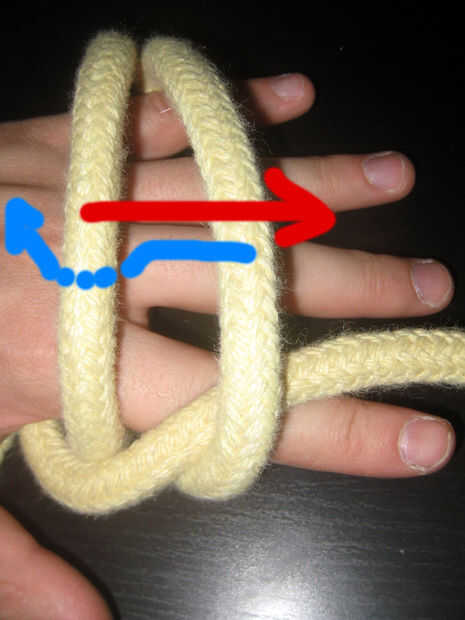 Enrollado en la palma que sube desde la parte inferior izquierda a superior derecha. Lazo de la cuerda detrás de los dedos y traerla hacia el frente, emergiendo en el lado derecho de su parte derecha (la larga cola que no está trabajando). Pone a sí mismo en su palma. Esto se muestra en el paso 1 (la primera foto).