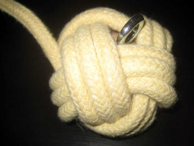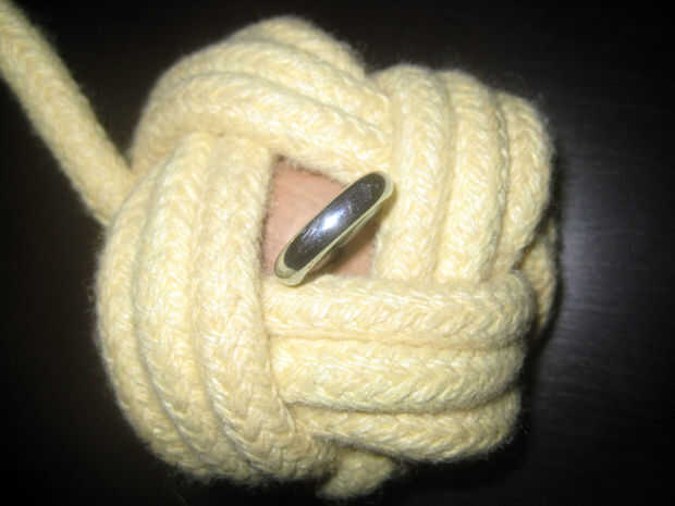 Jam el núcleo en el centro de su nudo (se mantenido flojo, derecha) para que el perno de anilla sobresale a través del agujero en el centro.