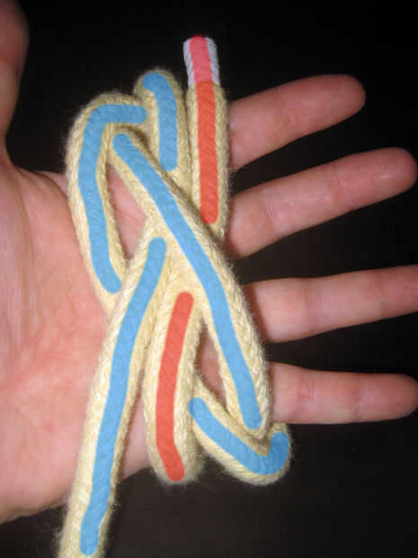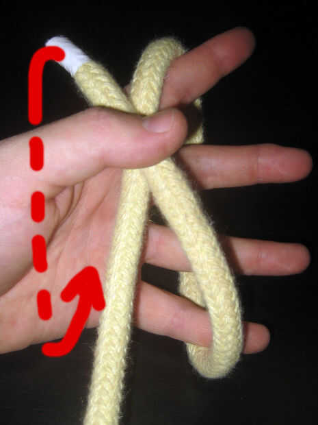 Soltar el extremo alrededor del dorso de la mano a la derecha de la cuerda existente.