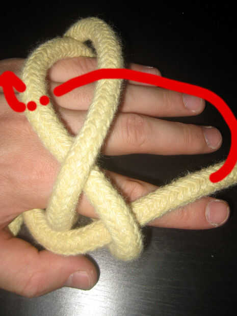 Cruzar el extremo del bucle que acaba a la izquierda del bucle original. Remétala bajo el original lazo en el dedo índice.