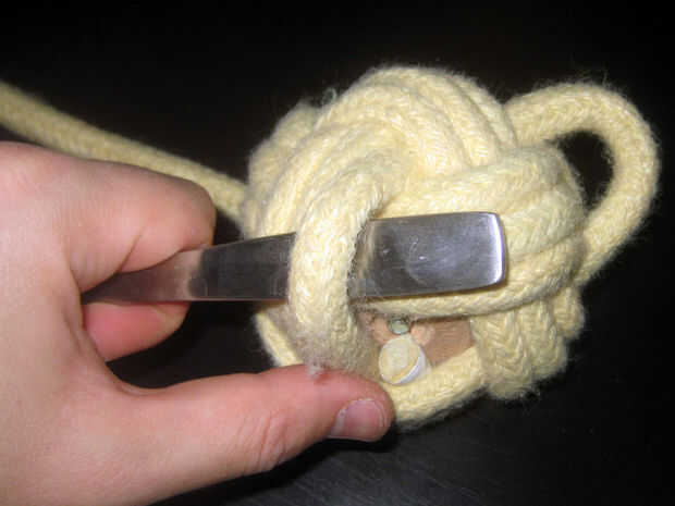 Eventualmente llegará a un punto donde no puede tirar la siguiente parte de la cuerda por el nudo porque el lazo en la parte superior está demasiado tenso. Esto es bueno, solo necesitas herramientas. Idealmente usted quiere un fid o marlinspike, pero hará todo lo que es lisa, delgada y fuerte. He utilizado el extremo romo de un cuchillo de mantequilla. Inserte la punta de la fid (improvisado?) bajo el siguiente filamento y trabajo suelta hasta que puede agarrar y tirar con los dedos. Trate de evitar el uso de alicates aquí porque se dañan las fibras y reducir la vida de su cabeza.