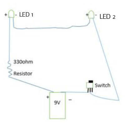 El circuito es muy simple. Se trata básicamente de 2 LEDs controlados por un interruptor a unas gafas de seguridad y algunas elásticas. Si nos fijamos en la imagen para este paso se le mostrará el esquema simple. Le partí la parte del circuito en 3 capítulos, LED 1, LED 2 y el interruptor.