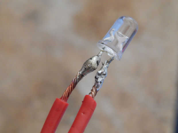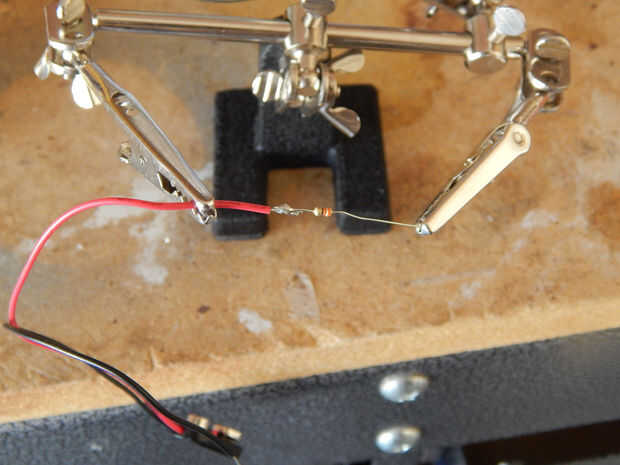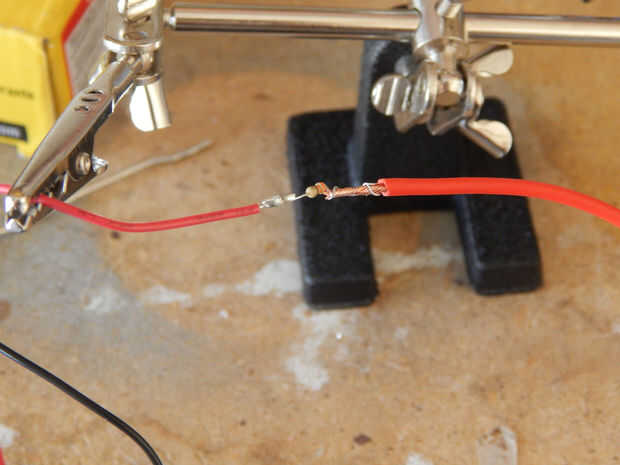 Después de haber terminado el paso (a) de 1 LED vas a soldadura en alambre para su resistencia. Asegúrese de que el cable llegue hasta el final de cristal (como en cuadro 3). Ahora está yendo a la soldadura en el hilo principal de la resistencia a la terminal positiva del LED 1 (como se muestra en la figura 4).