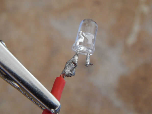 a) al finalizar todos de paso 3 debe obtener el cable soldado a la negativa terminal de 1 LED y soldadura a la terminal positiva del LED 2 (como se muestra en el cuadro 1).