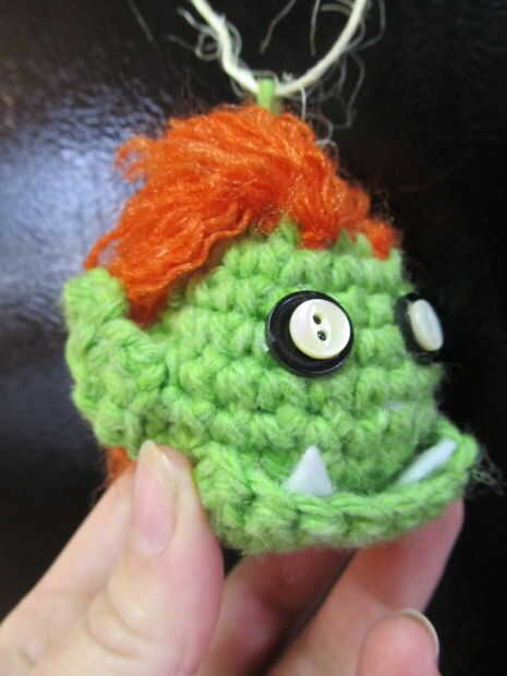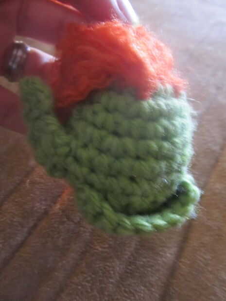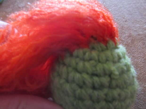 5. lazo un hilo naranja alrededor de las puntadas de un extremo de la bola de pelo y corte a la longitud deseada, luego peine hacia fuera.
