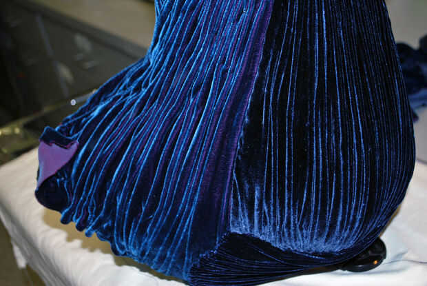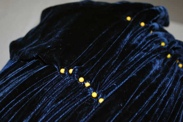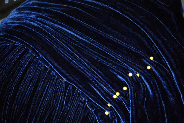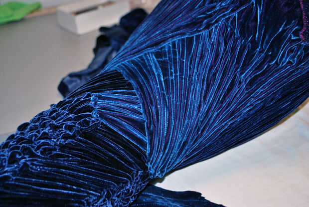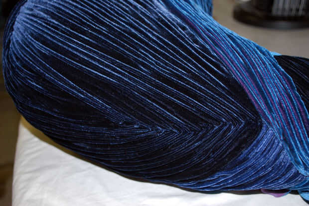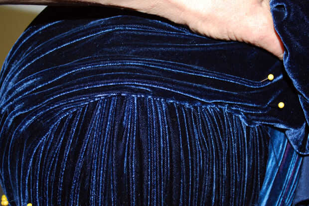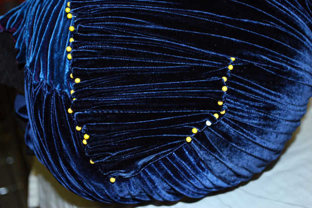 Primero tiró el terciopelo en diagonal y cubrió en mis pliegues, uno por uno. Cuando llegué al final de una sección, he cortado el exceso trozos de terciopelo, había doblado debajo de los bordes crudos e inmovilizados cada extremo. Cuando terminé los pliegues, he cortado el pedacito final de terciopelo, había doblado mis bordes sobre y cubrió a cada lado del doblez hacia abajo firmemente. Luego cosió todo abajo. Usé la aguja curvada para garantizar los pliegues pliegues y aguja de modista para coser los bordes plegados. Estos extremos consiguieron látigo cosido, porque estaban por debajo de la barriga y no sería realmente visibles.