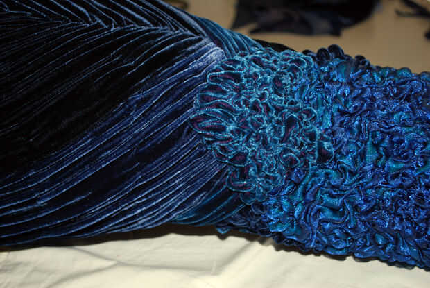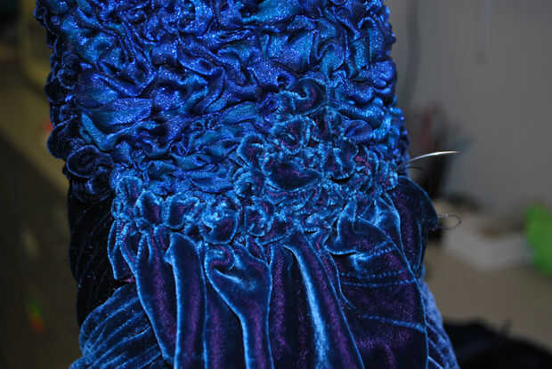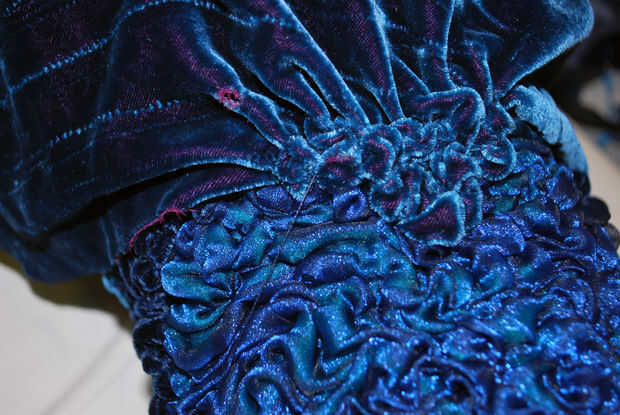 Ve muy bien y me quedaba tela a la izquierda, así que seguí adelante. Hacer más nudos, utilizando la técnica de círculo se reunieron y cosía hasta la garganta de pavo real. El plan consistía en ampliar la zona anudada creó un neckline bajo, sacado con pala. Cuando llegué al final del terciopelo, hice una fila de círculos más grandes se reunieron que acabó con todos los bordes de terciopelo crudo. Luego viraron hacia abajo de los centros de cada círculo así que crearon un borde más pluma, al igual que los hice en el cuello posterior.