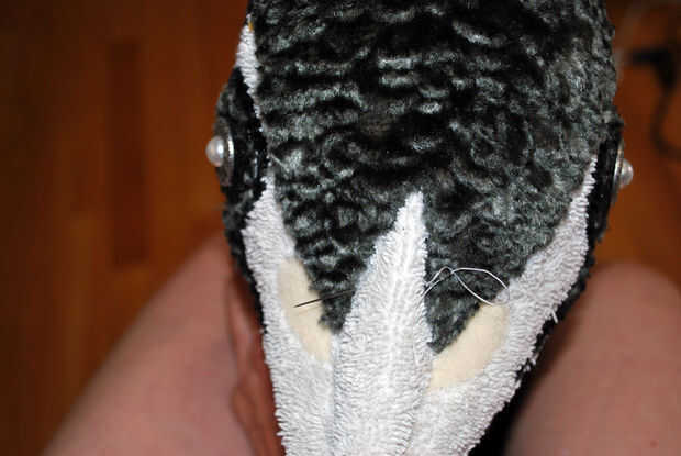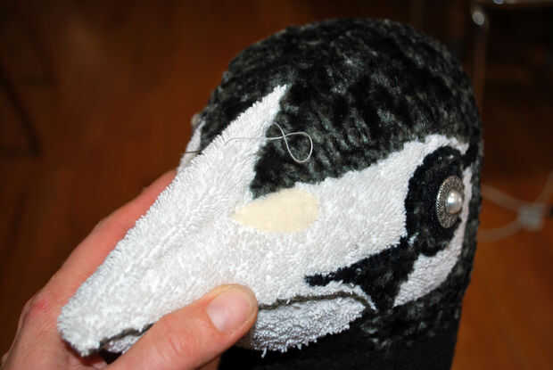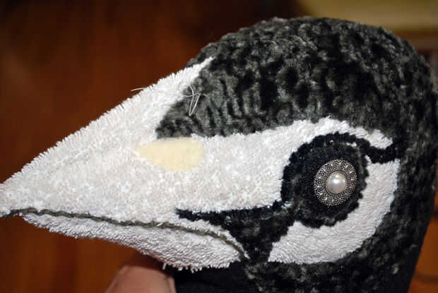 Ahora llegó el momento de la cresta superior del pico de la forma. Usé la misma técnica y escondió mi puntadas en el borde del terciopelo verde oscuro. Ahora mi pavo real tenía algunos forma y carácter a su rostro y parecía mucho menos como un dinosaurio. Seguro, aves están muy estrechamente relacionadas con dinosaurios. Todavía quería que el pavo real parece un pavo real!