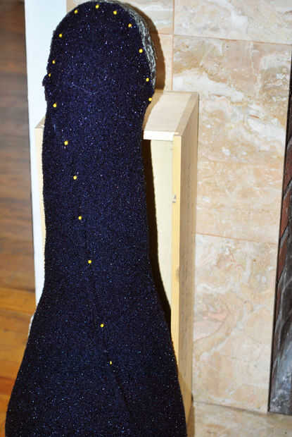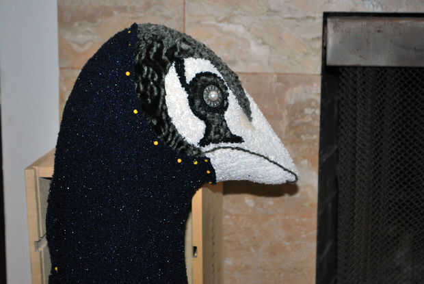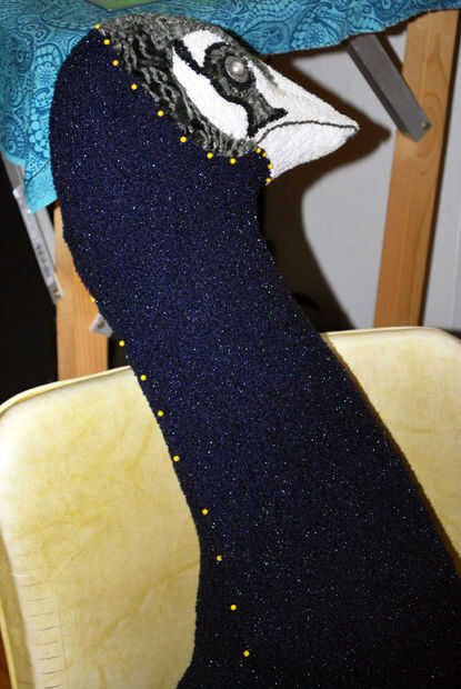 Después de esculpir el pico, sacó de mis piezas de falda azul nubbly y cubrió todo el cuerpo de pavo real para cubrir el fieltro negro. Planeé en cubriendo la mayor parte del pavo real con "plumas", pero en este momento no decidí cómo haría. Había una buena posibilidad de que algunos de la base de peacock mostraría bajo las plumas, no importa qué método que utiliza. El fieltro negro era ideal pero no es muy, bueno, como pavo real. La materia nubbly azul fue una muy buena opción, y lo había ya utilizado en algunos de mi pavo real "ojos" de pluma.