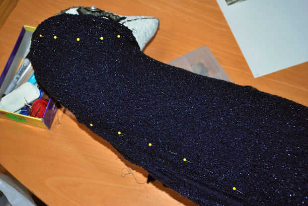 Una vez que la mayor parte del cuerpo en forma y cubrió, he cortado la tela extra en la parte superior de la cabeza del pavo real, dobla los bordes hacia abajo y había clavado justo en el borde del terciopelo verde oscuro. Luego sacó la aguja de modista y el hilo de poliamida azul marino y coser todos los bordes hacia abajo y todas las costuras cerraron. Látigo cosido los bordes, ya que mi costura estaba casi totalmente oculto por la textura de la tela azul.