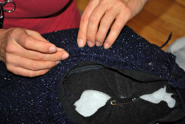 Vestido el azul sobre el cuerpo de pavo real y creado las costuras donde necesitaba para hacer que el cuerpo que ajuste bien y sin problemas. En las costuras, he cortado cualquier exceso tejido, dado vuelta los bordes crudos bajo y les cubrió en su lugar sobre el resto de la tela.